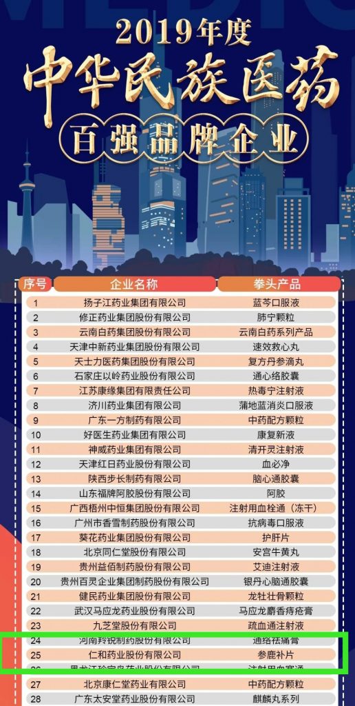 12月16日,中華全國(guó)工商聯(lián)醫(yī)藥業(yè)商會(huì)公布了2019年度中華民族醫(yī)藥百?gòu)?qiáng)品牌企業(yè)榜,仁和藥業(yè)股份有限公司連續(xù)4年入選,位列榜單第25位。自成立以來(lái),仁和始終秉承為人類健康服務(wù)的宗旨,繼承和創(chuàng)新中醫(yī)藥傳統(tǒng)衣缽,打造出“大活絡(luò)丸”、“強(qiáng)力枇杷膠囊”、“參鹿補(bǔ)片”等民族醫(yī)藥產(chǎn)品,為弘揚(yáng)民族醫(yī)藥事業(yè)發(fā)展作出了積極貢獻(xiàn)。