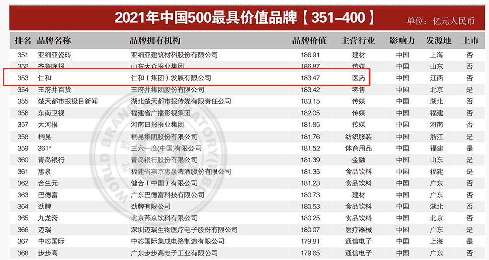 由世界品牌實驗室(World Brand Lab)主辦的(第十八屆)“世界品牌大會”于2021年6月22日在北京舉行,會上發(fā)布了2021年《中國500最具價值品牌》分析報告。“仁和”以183.47億元人民幣品牌價值位列榜單第353位,品牌價值較去年增長近30億元。這是仁和品牌連續(xù)十五年入選“中國500最具價值品牌”榜。