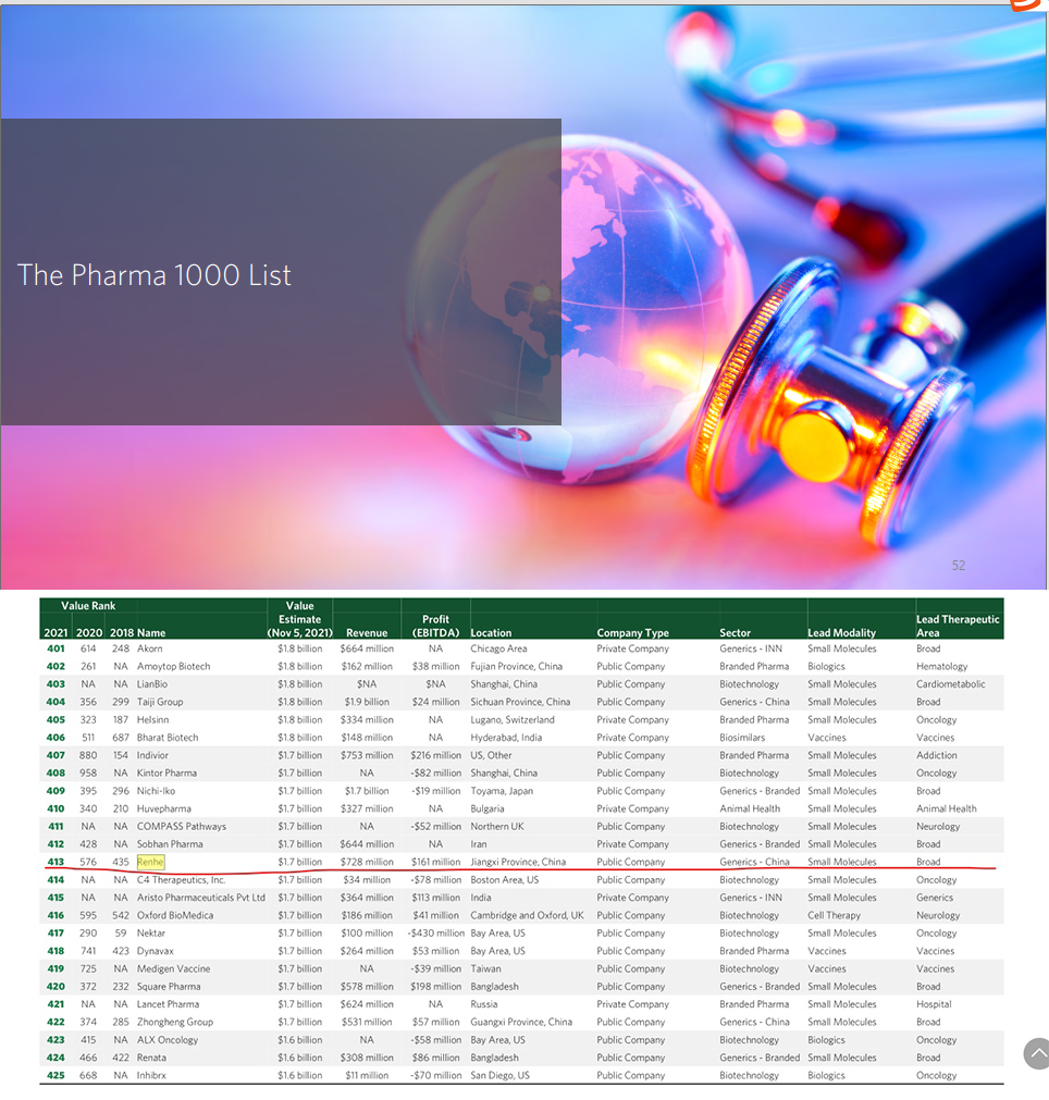 近日,具有較強(qiáng)世界影響力的權(quán)威機(jī)構(gòu)全球投行Torreya公布了2021年《全球1000強(qiáng)藥企報(bào)告》,該報(bào)告按估值對(duì)全球三萬余家制藥企業(yè)進(jìn)行研究后得出了排名。仁和以17億美元估值,位列世界千強(qiáng)藥企榜單413位,較2020年排名前移163位。值得一提的是,今年千強(qiáng)藥企中有249家中國藥企(包括港澳臺(tái)地區(qū)),去年約為208家。