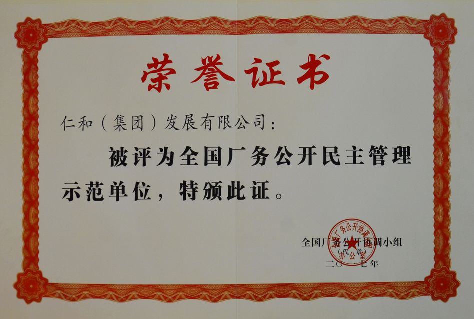 2017年全國廠務公開民主管理示范單位 榮譽證書 發布時間: 2019年12月18日 14:57:50 閱讀量: 9,557 下一篇:仁和集團榮膺“全國廠務公開民主管理示范單位”上一篇:集團榮獲2017年中國制藥工業百強